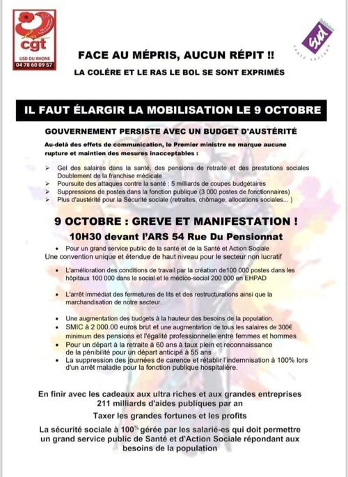 Pour en finir avec l’austérité, grève jeudi 2 octobre et manif à 13h place J Macé à Lyon 7ème
