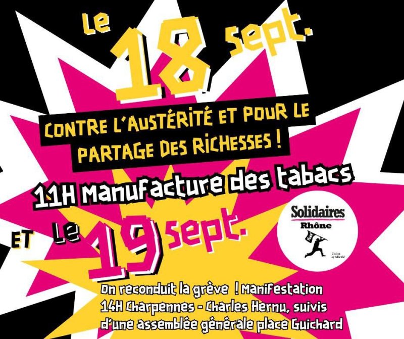 14 septembre 2025Jeudi, grève et manif appelées par l’Intersyndicale : à 11h, de la Manufacture des tabacs (Métro Sans souci) à Bellecour