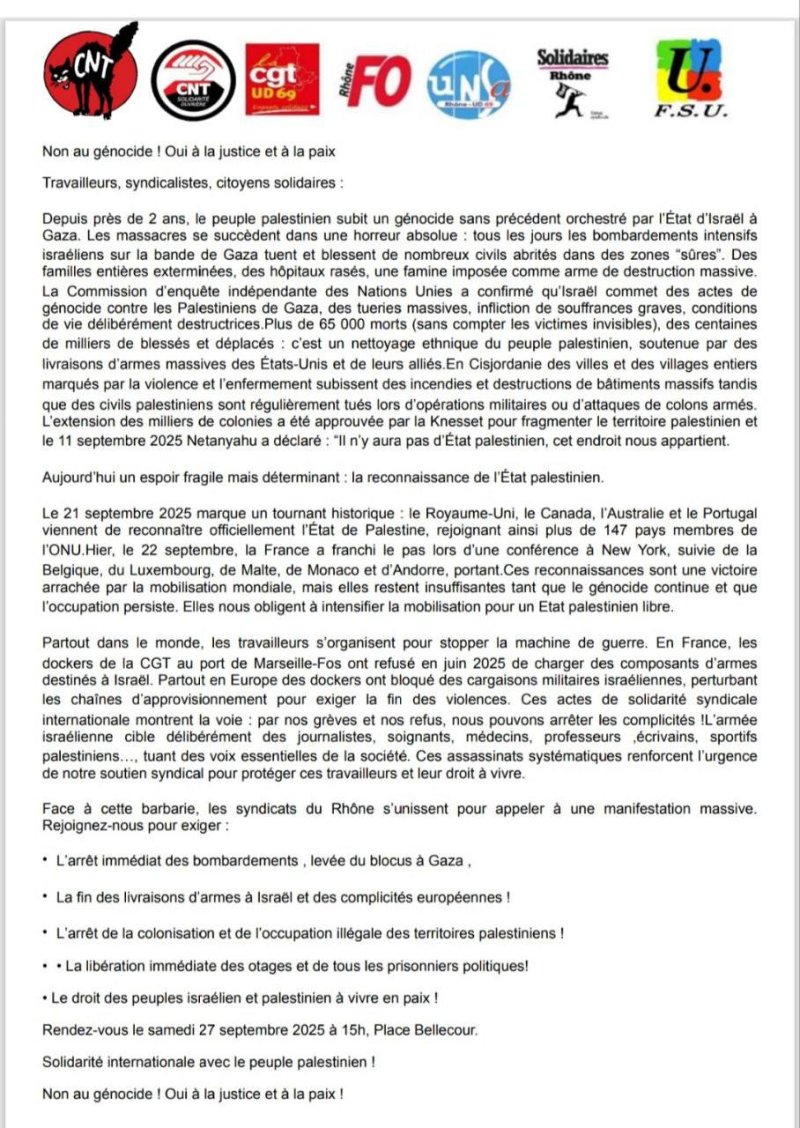 25 septembre 2025à 15h à partir de Bellecour, à l’appel du Collectif 69 Palestine