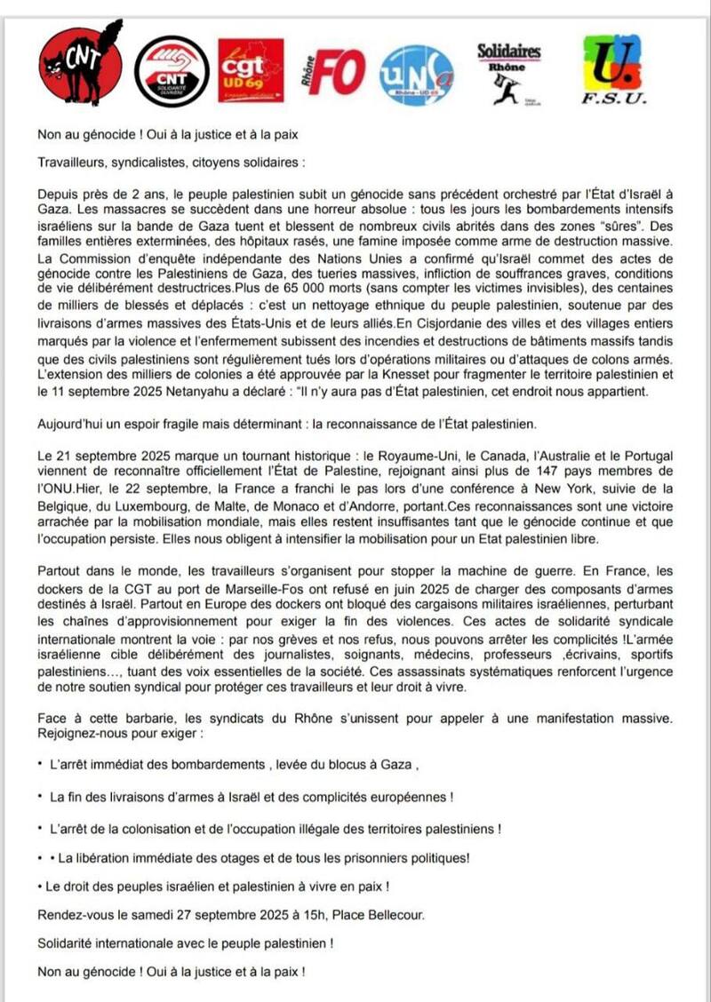 • Manif contre le blocus de Gaza samedi 27 septembre à Lyon
