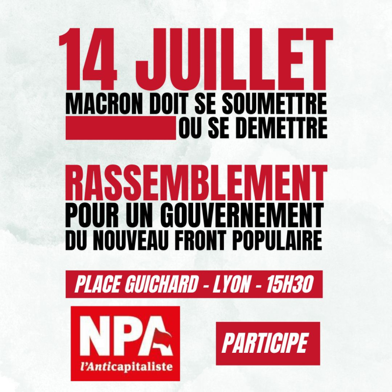 13 juillet 2024Rassemblement à Lyon 3ème, place Guichard, à partir de 15h30, à l’appel de LFI, NPA l’Anticapitaliste, Mouvement des Kanaks en France - Auvergne Rhône Alpes, UNEF, Union Syndicale Lycéenne, Jeunes Ecologistes, Jeunesses Anticapitalistes, ...