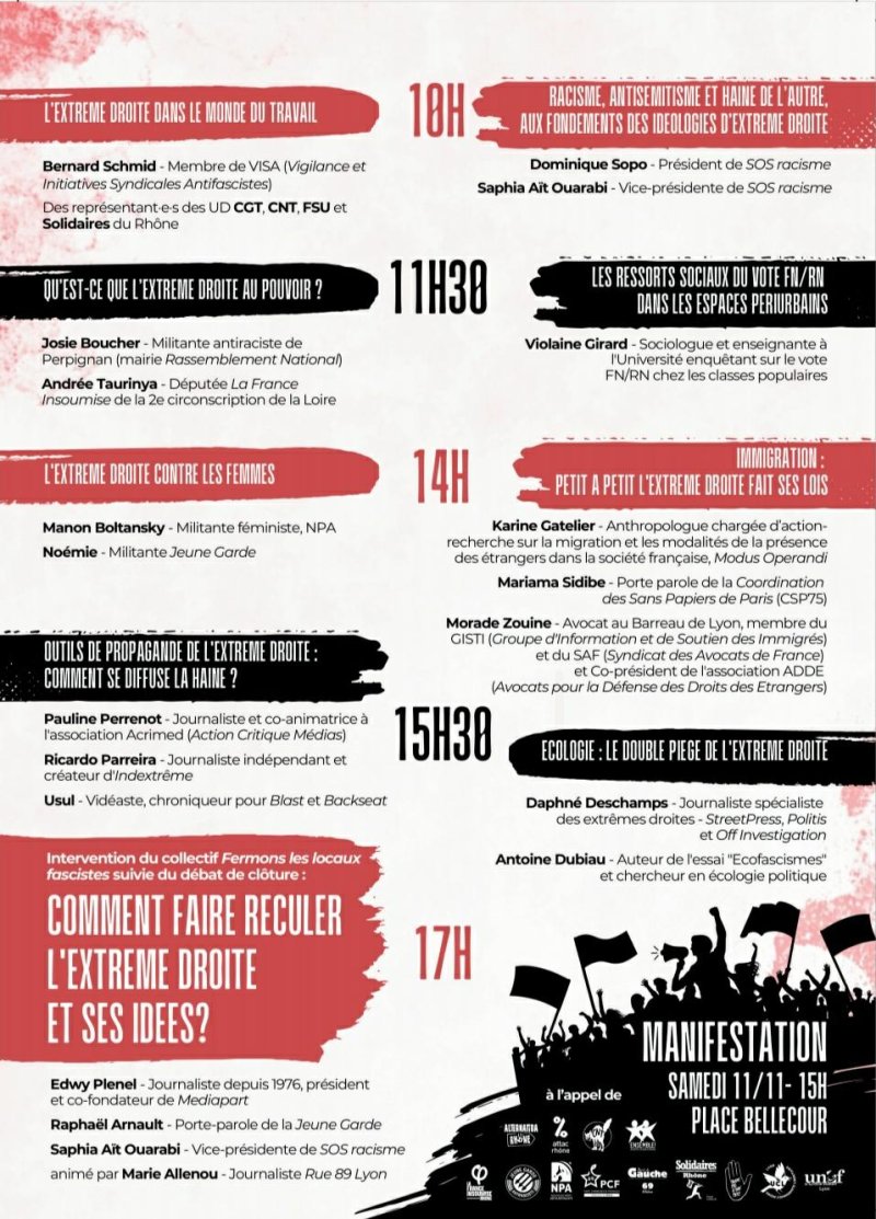 “Cela fait maintenant plus de 10 ans que se développent des milices violentes dans notre ville. Nous les avons combattues fermement avec le collectif Fermons les Locaux Fascistes et avons obtenu la fermeture de trois de leurs locaux. Aujourd’hui il en reste, notamment la Traboule et l’Agogé dans le Vieux-Lyon. Si Lyon est considérée comme un laboratoire de l’extrême droite radicale, la situation s’est malheureusement détériorée sur l’ensemble du territoire, jusque dans nos institutions : à l’heure où l’extrême droite tente de semer la confusion partout, avec la volonté de casser tous nos repères politiques et moraux, nous devons nous retrouver pour échanger, nous former, débattre.