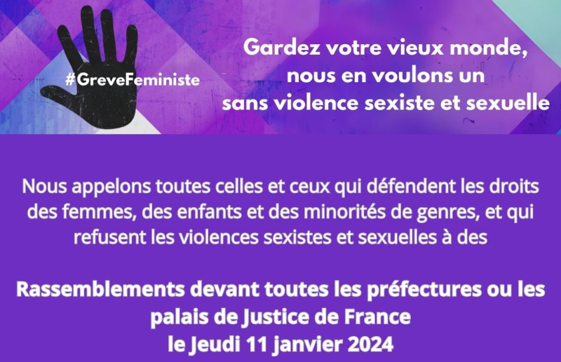 Nous appelons toutes celles et ceux qui défendent les droits des femmes, des enfants et des minorités de genres, et qui refusent les violences sexistes et sexuelles à des rassemblements devant toutes les préfectures ou les palais de Justice de France le Jeudi 11 janvier 2024."