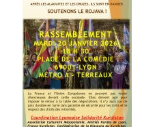 organisée par l’association "Amitiés kurdes de Lyon" à 18h30 avec Kerim Kamar, représentant de l’administration autonome du Nord Est de la Syrie (AANES) en France à la Mairie du 1er arrondissement, 2, place Sathonay, métro Hôtel de Ville