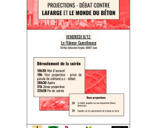 Dans le cadre des journées d’actions contre Lafarge et le monde du béton, le comité local des Soulèvements de la Terre Lyon et environs organise avec Lyon avec XR (Extinction Rébellion), Dernière Rénovation, Attac (Association pour la taxation des transactions financières et pour l’action citoyenne), Youth for climat et Stop Total, une soirée projections-débat.
