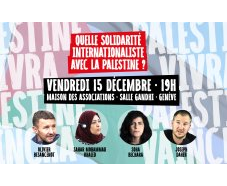 Soirée-débat sur Quelle solidarité internationaliste avec le peuple palestinien ? Vendredi 15 décembre · 19h à la Maison des Associations - Salle Gandhi - 15, rue des Savoises · Genève un covoiturage est organisé de Lyon, contacte les militantEs du NPA 69 ou npa69 (arobase) npa-mail.org ! À Gaza, nous assistons à une guerre à tendance génocidaire dans laquelle les principales victimes sont les enfants (en moyenne 136 par jour sont assassinés), femmes et vieillards. L’armée israélienne soumet (…)